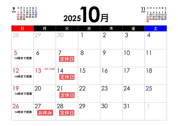 10月は火曜定休日以外に、27日(月)がお休みとなります。